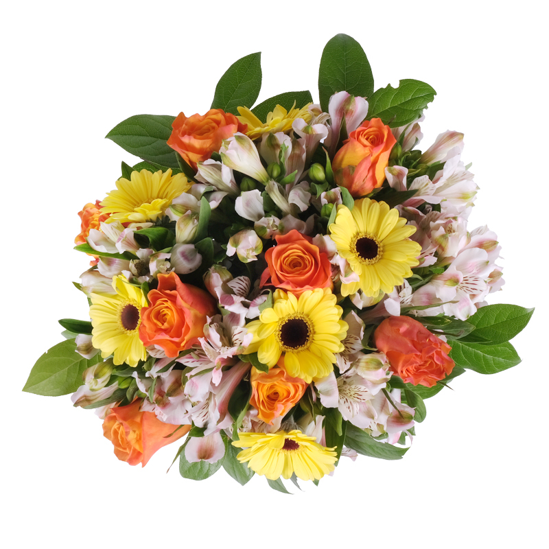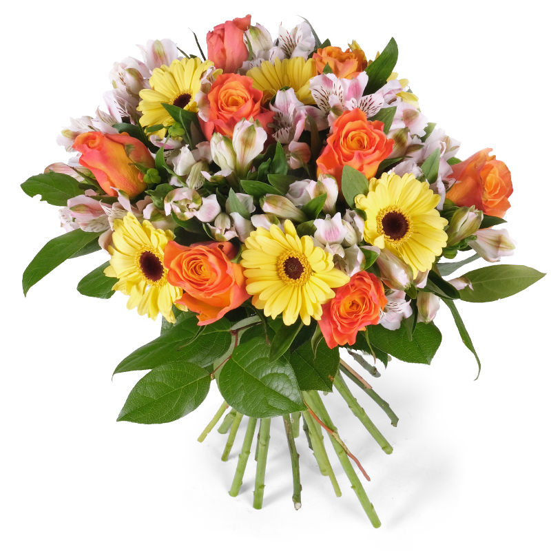 Zawsze świeże kwiaty Kolorowa kompozycja róż, gerber i alstromerii otoczona obfitymi, świeżymi liśćmi emanuje naturalnością i świeżością. To bukiet, który wnosi równowagę i harmonię. Idealny prezent dla osób szukających spokoju i piękna.